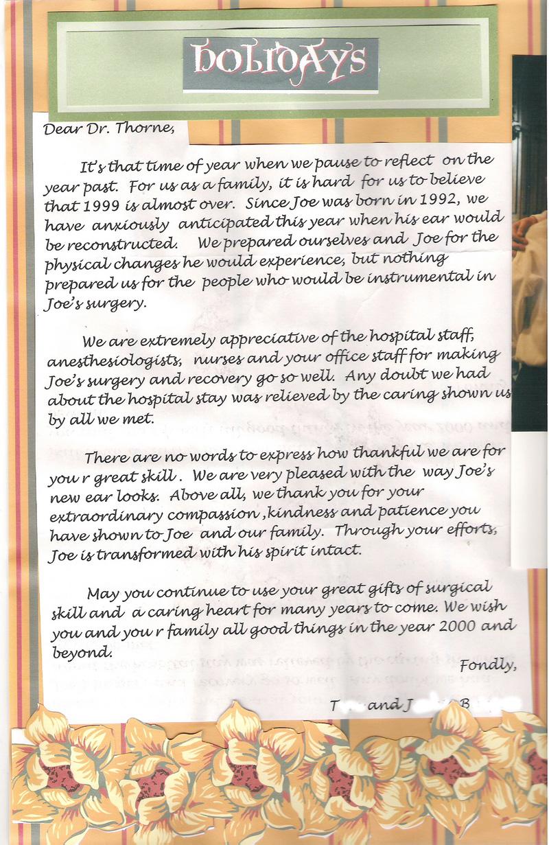 There are no words to express how thankful we are for your great skill. We are very pleased with the way Joe’s new ear looks. Above all, we thank you for your extraordinary compassion, kindness and patience you have shown to Joe and our family. Through your efforts, Joe is transformed with his spirit intact.